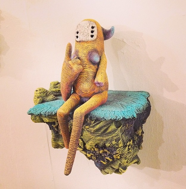 "Forlorn and Floating", It's a ceramic Sculpture finished with ceramic glazes and Encaustic wax. The Piece mounts on to any wall and it is approximately 8" x 16' x 10".