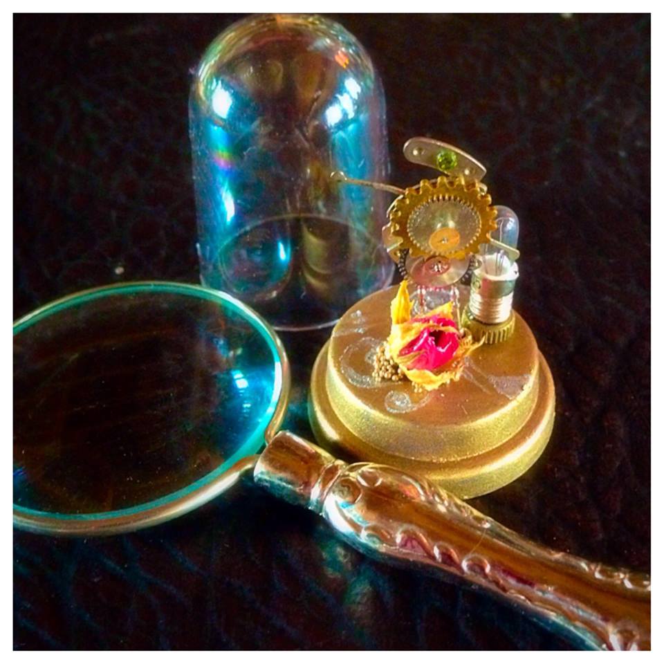 Title: Bican Watchbot Miniature sculpture created with watch parts, real mini rose, mini light bulb, & genuine peridot gemstones. Comes with acrylic dome (for transporting) and mini magnifying glass.