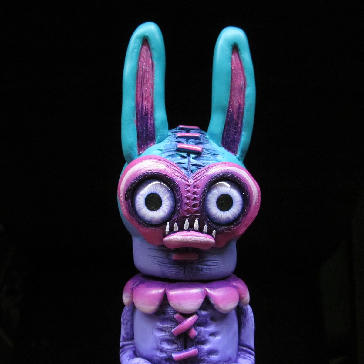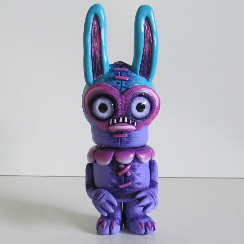 Bub Bun is a 6" two-part, roto cast, purple resin figure with glass eyes. The head articulates 360. Bun Bun is 100% hand painted by artist