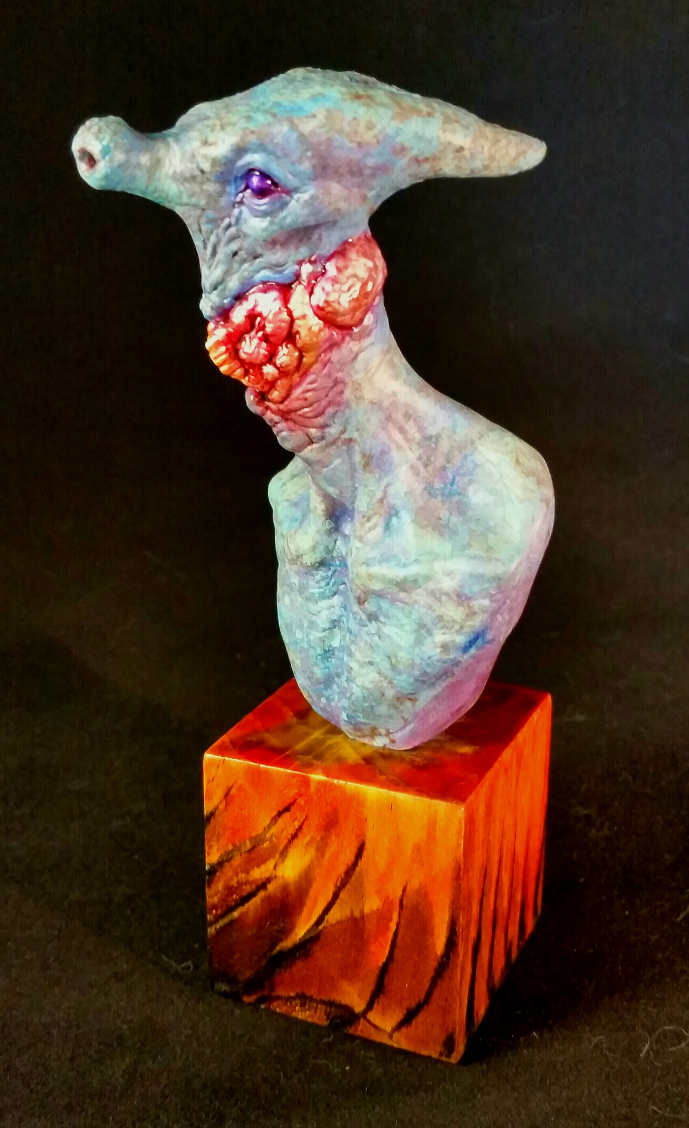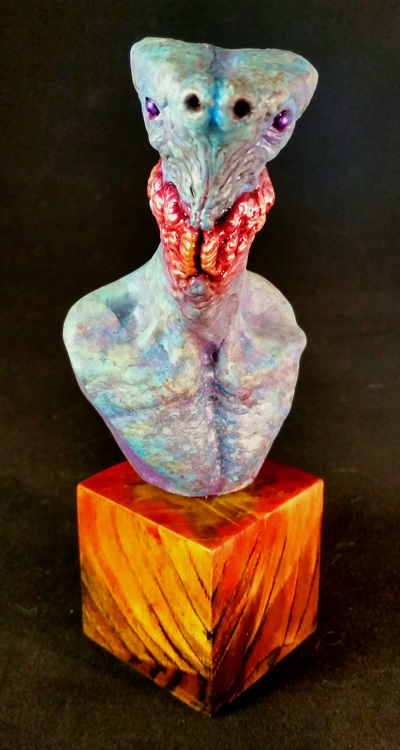 Name of bust is "KRANK" Sculpted by Calvin Lo and painted by Mike Swisstack of Cthulhugizzard Customs. Bust measures 6 inches Tall , 2.5 inches wide , 4 inches deep . Value is $80 . It is a resin cast of a sculpt by Calvin Lo painted and mounted on wood by Mike Swisstack of Cthulhugizzard Customs