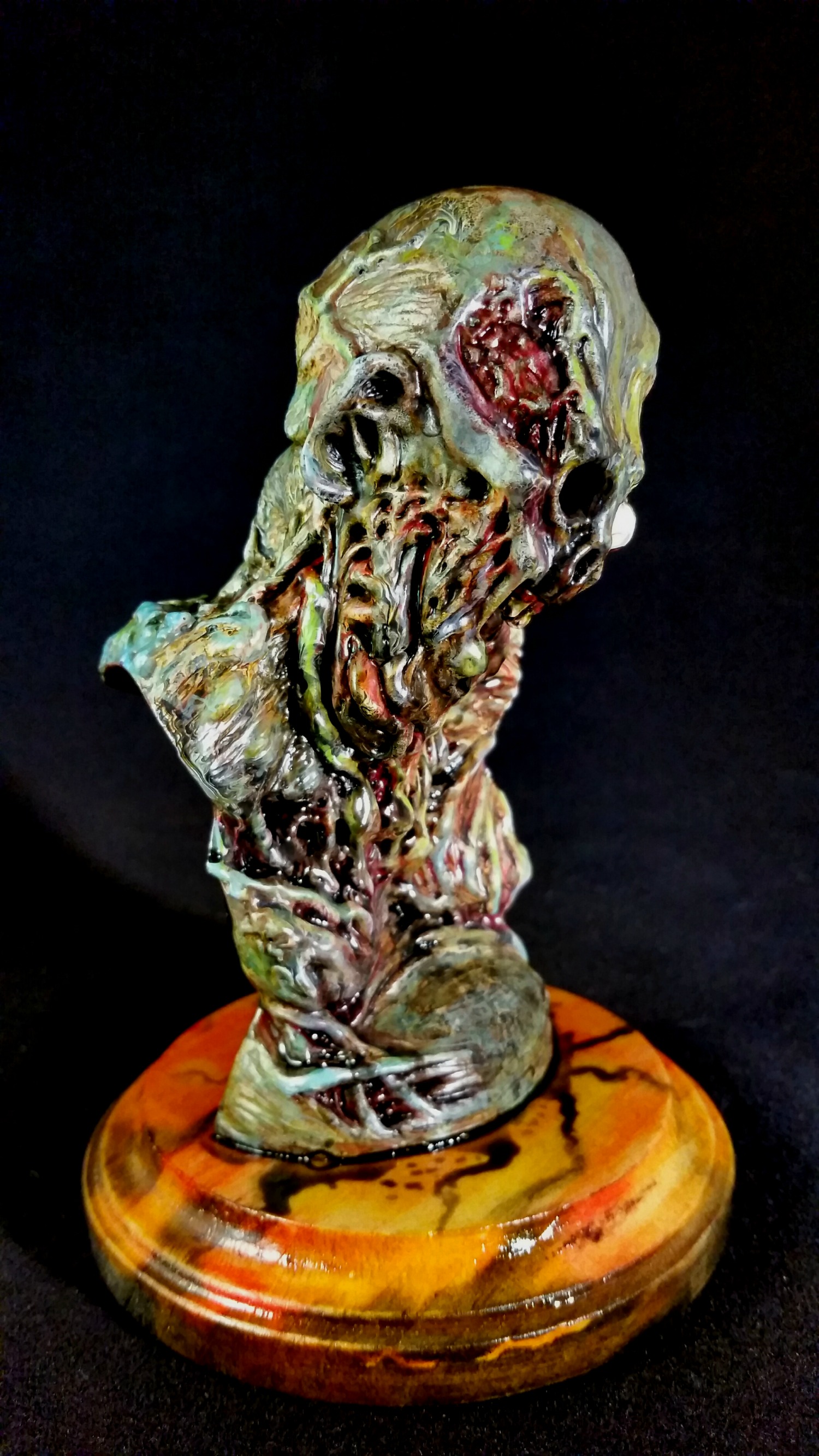 Name of bust is "Dead Fat Zombie " Sculpted by Cheng Shuo Lee and painted by Mike Swisstack of Cthulhugizzard Customs. Bust measures 6 inches Tall , 4 inches wide , 4 inches deep . Value is $100 . It is a resin cast of a sculpt by Chenge Shuo Lee painted and mounted on wood by Mike Swisstack of Cthulhugizzard Customs.