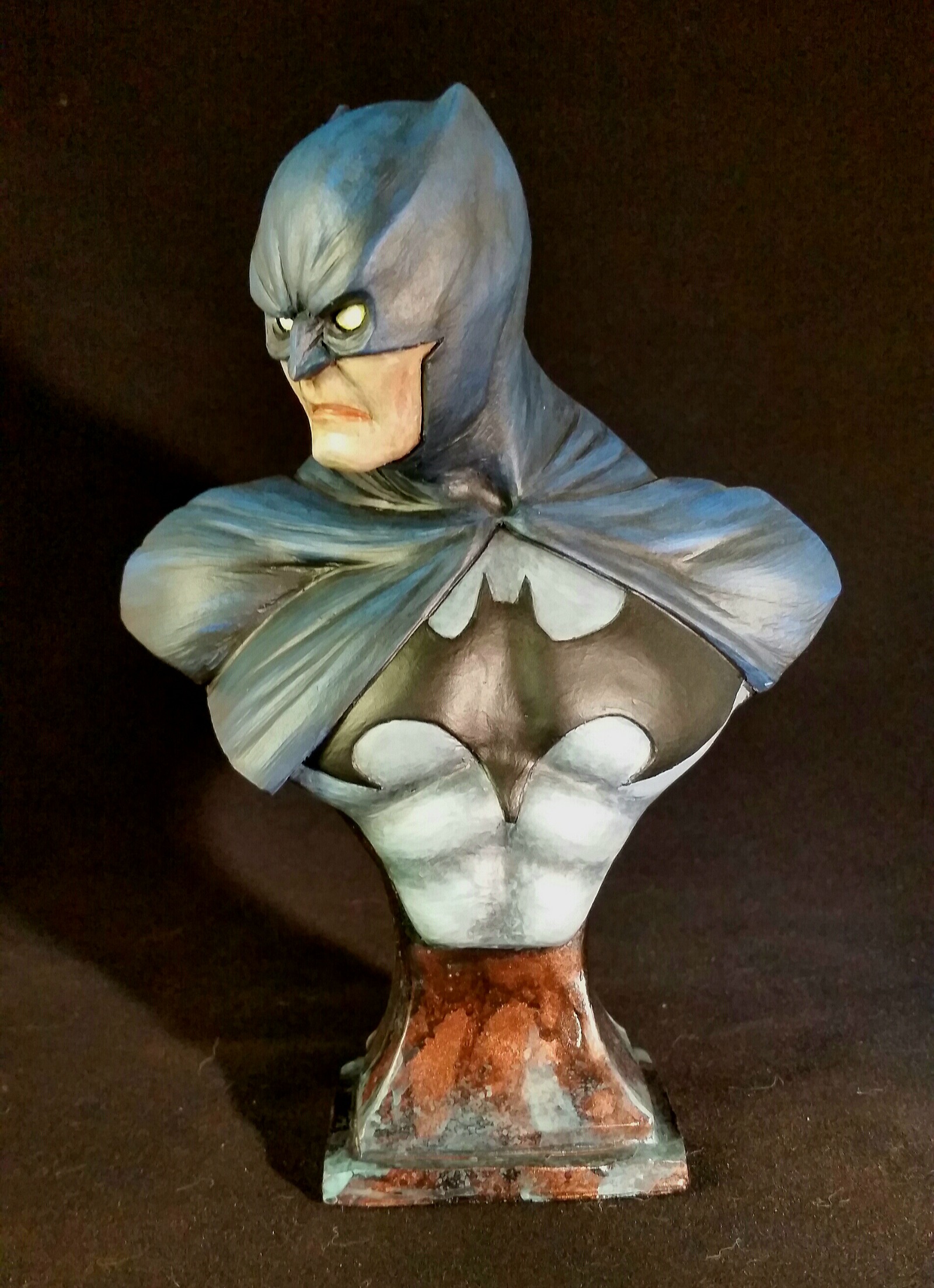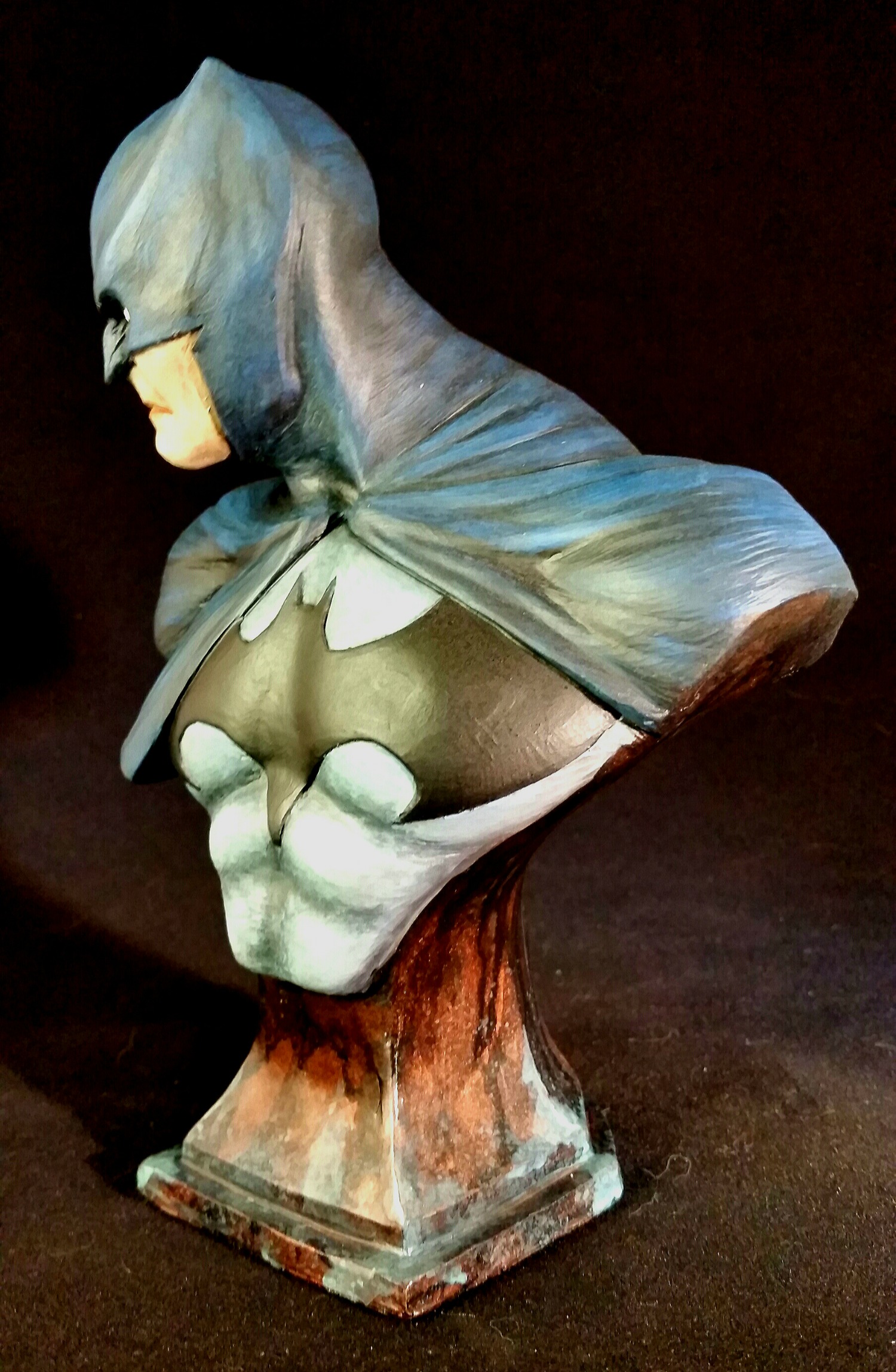 Name of bust is "Batman " Sculpted by Michael White and painted by Mike Swisstack of Cthulhugizzard Customs. Bust measures 8 inches Tall , 6 inches wide , 4 inches deep . Value is $450 . It is a resin cast of a sculpt by Michael White painted by Mike Swisstack of Cthulhugizzard Customs