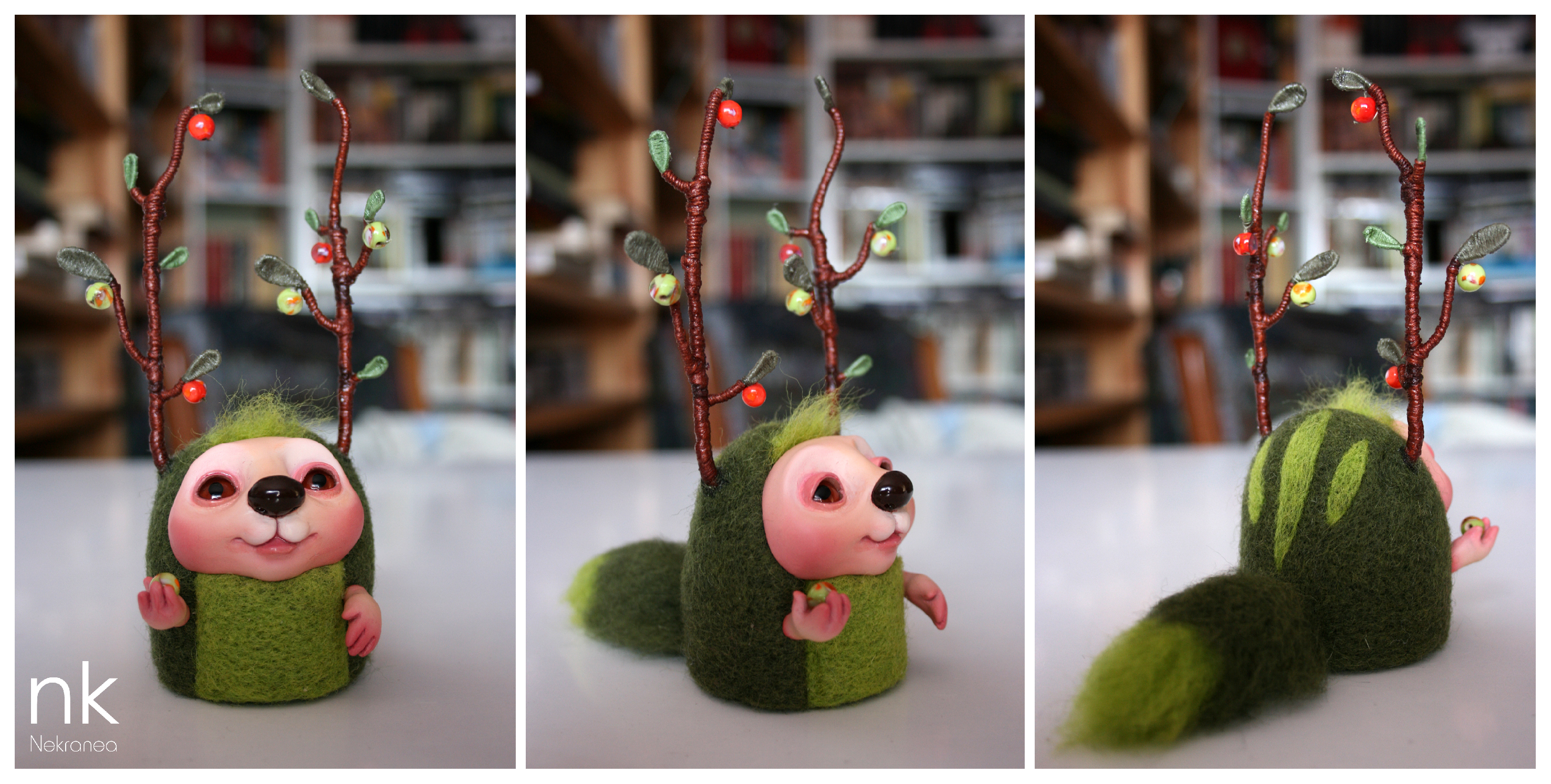 Nisa· Ooak (one of a kind) Art Doll by Jezabel Nekranea Size: 15 cm tall aprox. Media: -body: needle felted. -face and hands: crystal eyes, polymer clay painted with acrylics and pastels and varnished. -horns: wire, cotton yarn and plastic beads.